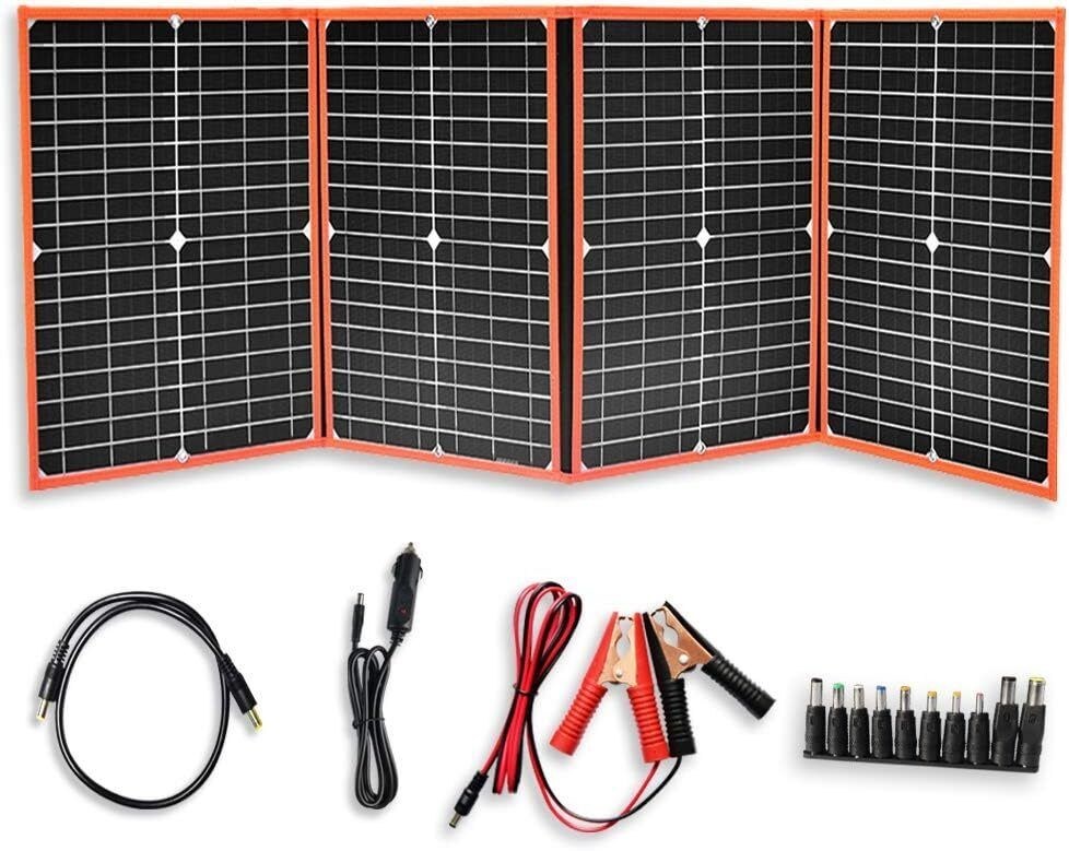 [Vários adaptadores]O painel solar dobrável integra DC (18V), DC adaptador clip de jacaré, bateria recarregável 12V, pode ser adaptado a 10 tipos de conectores DC, tem várias utilizações,e pode carregar laptops, fontes de alimentação portáteis, etc. Adaptador isqueiro recarrega a bateria do carro.